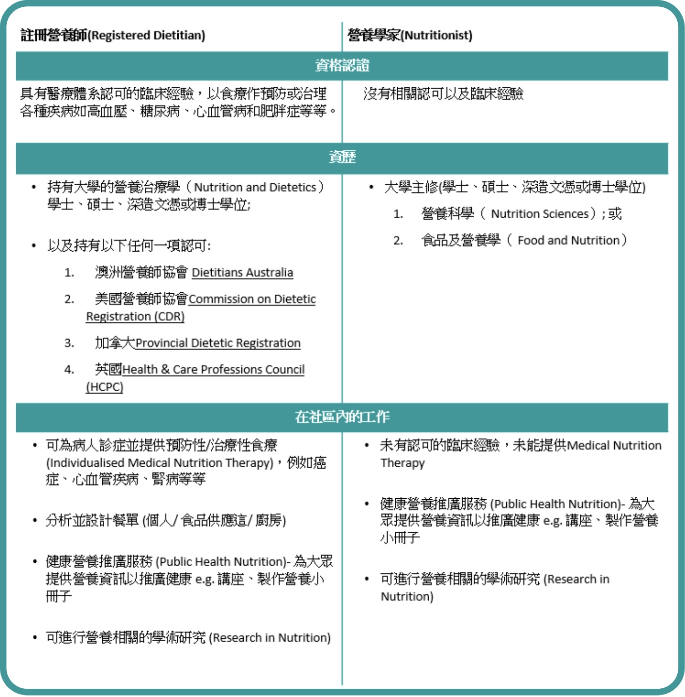 香港執業的營養師主要分為兩種 – 註冊營養師 (Dietitian)和營養學家 (Nutritionist)。